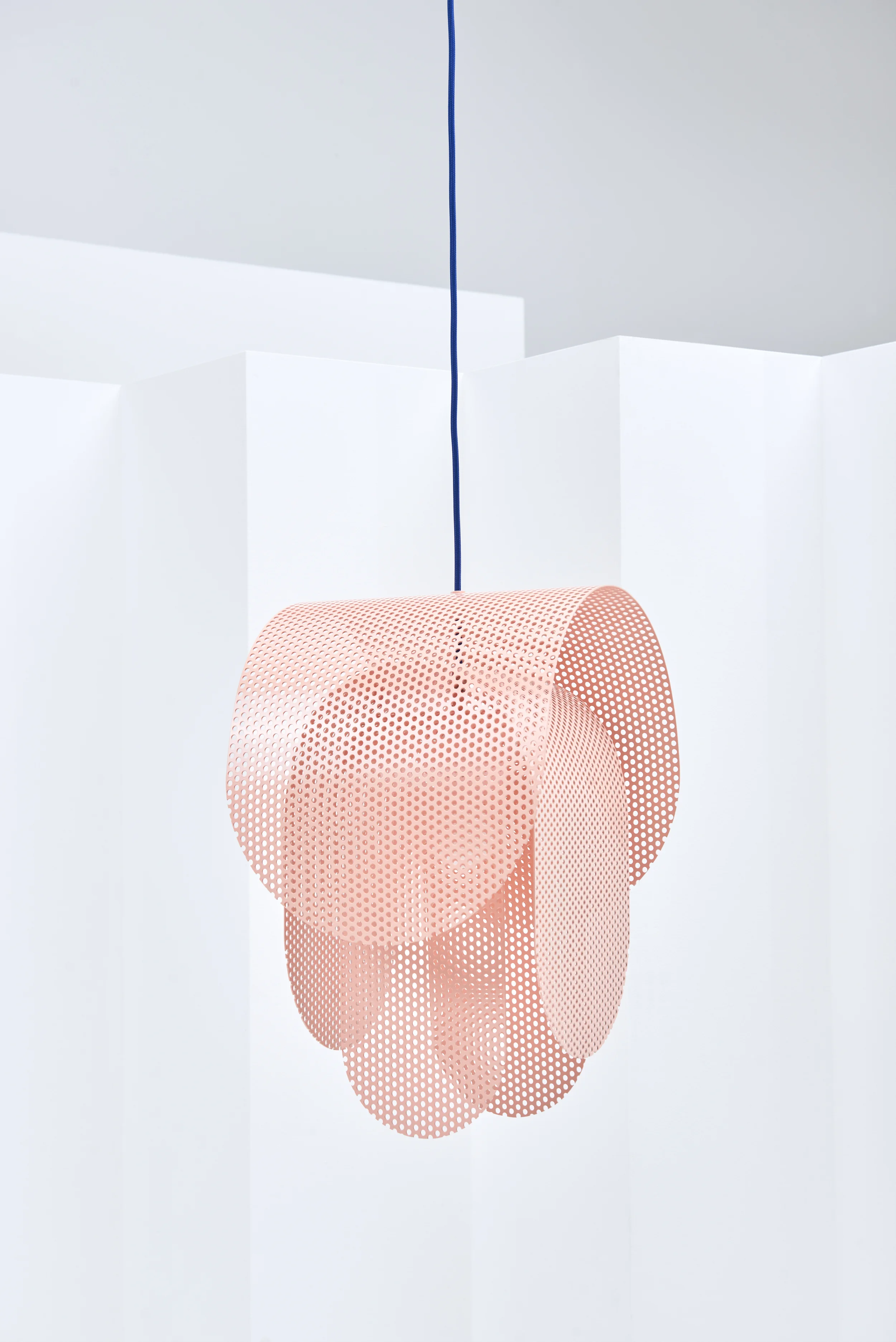 The SUPERPOSE pendant lamp consists of three bent and rounded aluminium sheets which are concentrically arranged arround each other, shifted at a precise 180-degree angle. The accurate balanced proportions vary to the inside of the lamp.