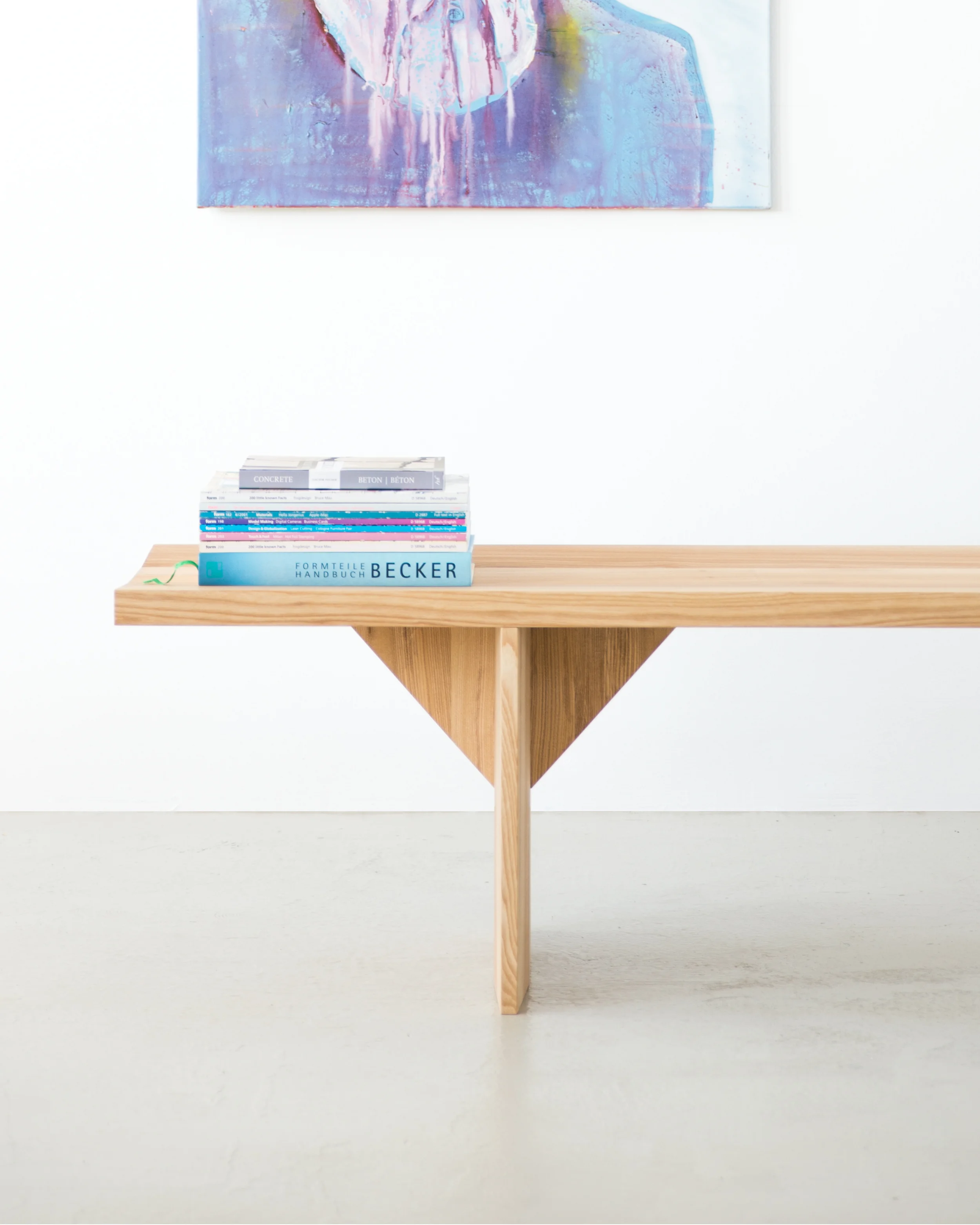 The legs are joined together by two slotted solid wood parts and are installed with the seat by using only four hidden screws. The handpicked domestic wood has slightly bevelled surfaces which gives it a clean and modern shape. Further thus the seating area is more comfortable and the used material is reduced to the essentials.